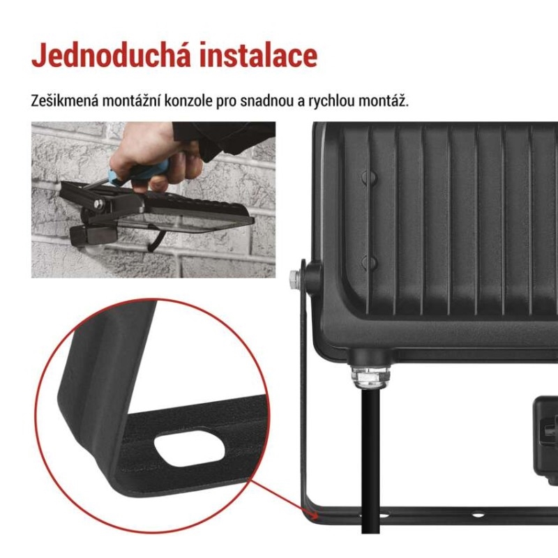 Reflektory GLARO s PIR senzorem jsou navrženy s praktickou zešikmenou montážní konzolí, která umožňuje rychlou a pohodlnou instalaci na stěnu, fasádu či jiný podklad. Díky možnosti nastavení úhlu osvětlení přesně podle potřeby můžete světlo směrovat tam, kde je nejvíce potřeba, aniž by bylo nutné složité vrtání či úpravy. Jednoduchá montáž šetří čas i námahu a dělá z GLARO ideální volbu pro domácí instalace.