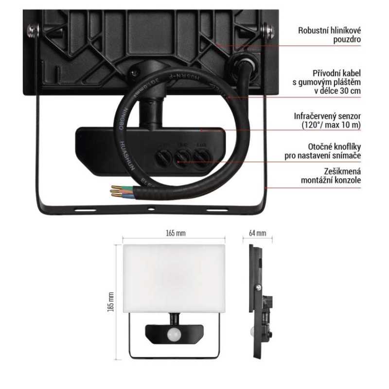 akumulátor: neuvádí se|barva: černá|barva světla: neutrální bílá|délka přívodního kabelu: 30 cm|doba svícení na AKU: neuvádí se|dosah PIR senzoru: 10 m|energetická třída použitého světelného zdroje: F|flicker-free: ano|frekvence: 50/60 Hz|index podání barev (CRI): Ra > 80|kategorie: CLASSIC|krytí: IP54|materiál difuzoru: plast (PC)|materiál přívodního kabelu: guma|materiál těla: hliník|napájení: ze sítě|napětí: 220–240 V~|PIR senzor: ano|počet průchozích zásuvek: 0|použití: povrchová montáž|příkon: 30 W|prodejní obal: 1 ks, krabice|proud: 135 mA|řada: TAMBO|rozměr: 165 × 185 × 64 mm|rozsah pracovní teploty: -20 °C až +40 °C|stmívání: ne|stupeň ochrany proti mechanickým nárazům: IK06|světelná účinnost: 100 lm/W|světelný tok: 3 000 lm|teplota chromatičnosti: 4 000 K|typ přívodního kabelu: neuvádí se|typ průchozích zásuvek: neuvádí se|typ stmívání: –|účiník: > 0,9|úhel vyzařování: 120°|záruční doba: 3 roky|zdroj světla: LED|životnost: 25 000 hodin|zkušební žárovka součástí balení: ne