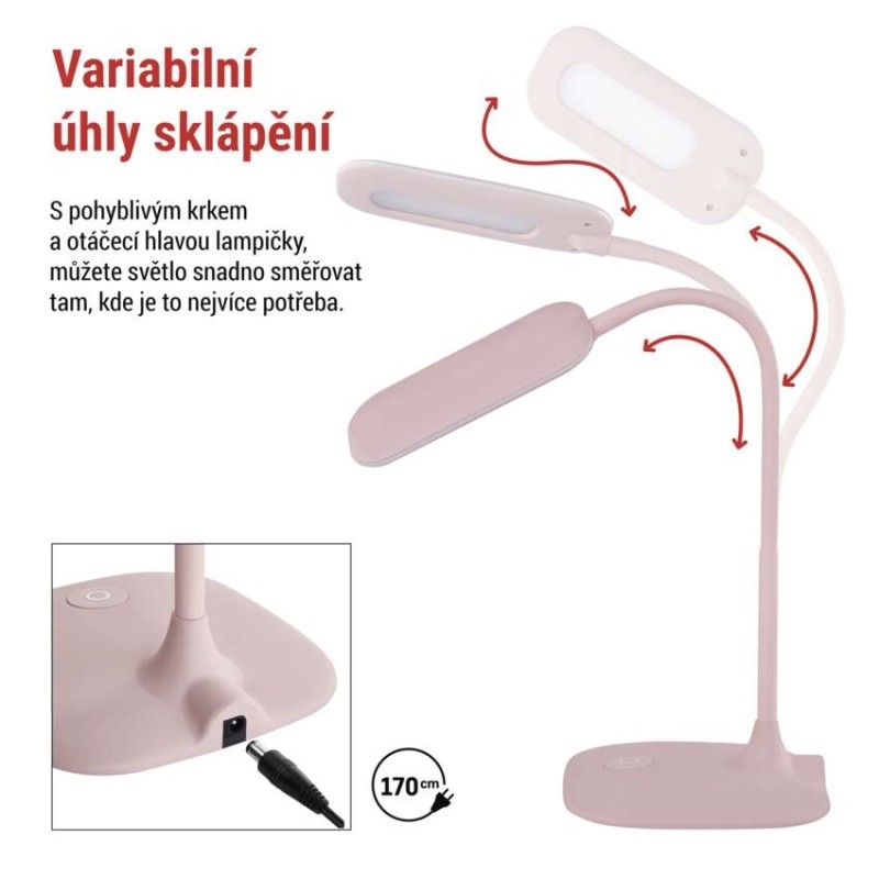barva: růžová|barva světla: neutrální bílá|činitel stárnutí: neuvádí se|čip LED: SMD|délka přívodního kabelu: 1,7 m|energetická třída: A+|energetická třída (od 1.9.2021): neuvádí se|index podání barev (CRI): Ra >80|integrovaná nabíjecí baterie: ne|krytí: IP20|materiál: kov, plast + guma|max. výkon: 6,5 W|napájecí zdroj: 12 V/400 mA|napájecí zdroj součástí balení: ano|napětí: 100–240 V|obsah rtuti: <0 mg|patice (uchycení žárovky): neuvádí se|počet LED: 12|počet spínacích cyklů: 15 000|příkon: 6,5 W|prodejní obal: 1 ks, krabice|rozměr: 160 × 550 × 345 mm|rychlost náběhu na 100 %: 0 s|stmívání: ano|světelný tok: 400 lm|teplota chromatičnosti: 4 000 K|typ napájení: síť|účiník: neuvádí se|USB port: ne|životnost: 30 000 hodin