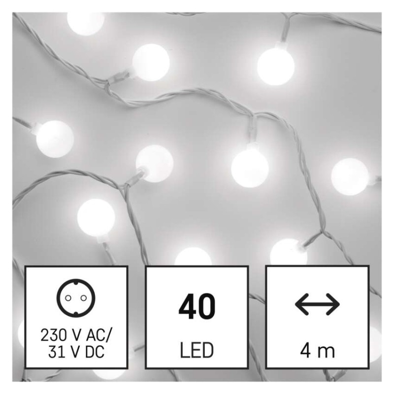 barva drátu: bílá|barva světla: studená bílá|časovač: ano|dálkový ovladač: ne|délka přívodu: 5 m|funkce: svítí|krytí: IP44|LED mezera: 10 cm|materiál: PVC|možnost propojení: ne|počet LED: 40|použití: venkovní i vnitřní|příkon: 3,6 W|prodejní obal: 1 ks, krabice|produkt: řetěz|pro výšku stromu: 100 cm|rozměr: 4 m|tvar: kulička|typ napájení: síťový adaptér|velikost LED: 25 mm|vstupní napětí: 230 V AC|výstupní napětí: 31 V DC|záruční doba: 2 roky|životnost: 10 000 hodin