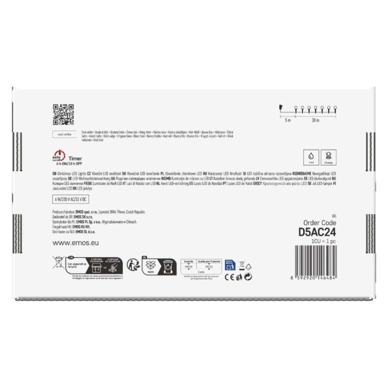 barva drátu: zelená|barva světla: studená bílá|časovač: ano|dálkový ovladač: ne|další funkce: –|délka přívodu: 5 m|funkce: 8 módů (multifunkce)|jazyky aplikace: –|kompatibilita: –|krytí: IP44|LED mezera: 10 cm|materiál: PVC|možnost propojení: ne|notifikace do mobilní aplikace: ne|ovládání hlasovými asistenty: ne|počet LED: 300|podporované OS: –|použití: venkovní i vnitřní|přenosová frekvence: –|příkon: 6 W|prodejní obal: 1 ks, krabice|produkt: řetěz|protokol: –|pro výšku stromu: 250 cm|rozměr: 30 m|tvar: kulička|typ napájení: síťový adaptér|velikost LED: 10 mm|vstupní napětí: 230 V AC|výstupní napětí: 31 V DC|záruční doba: 2 roky|životnost: 10 000 hodin