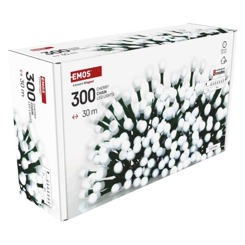 EMOS LED vánoční cherry řetěz – kuličky, 30 m, venkovní i vnitřní,studená bílá,programy,časovač