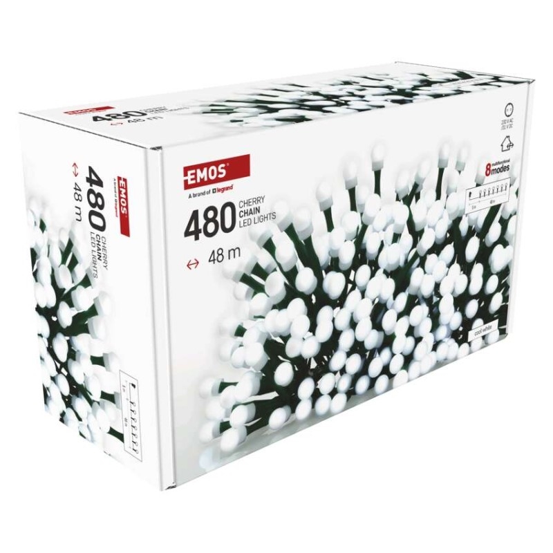 EMOS LED vánoční cherry řetěz – kuličky, 48 m, venkovní i vnitřní,studená bílá,programy,časovač