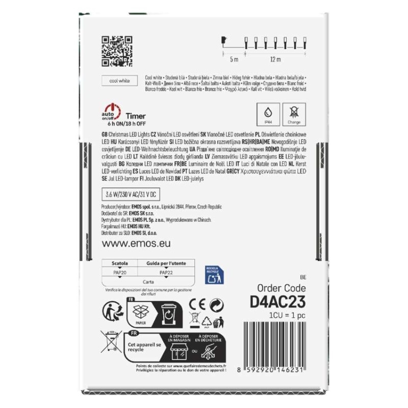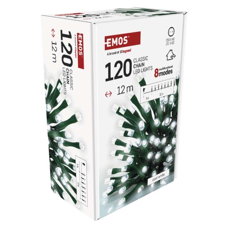 EMOS LED vánoční řetěz, 12 m, venkovní i vnitřní, studená bílá, programy, časovač