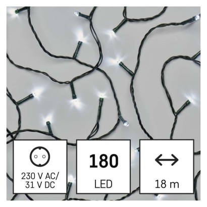 barva drátu: zelená|barva světla: studená bílá|časovač: ne|dálkový ovladač: ne|délka přívodu: 5 m|funkce: 8 módů (multifunkce)|krytí: IP44|LED mezera: 10 cm|materiál: PVC|možnost propojení: ne|počet LED: 180|použití: venkovní i vnitřní|příkon: 3,6 W|prodejní obal: 1 ks, krabice|produkt: řetěz|pro výšku stromu: 230 cm|rozměr: 18 m|tvar: klasický|typ napájení: síťový adaptér|velikost LED: 5 mm|vstupní napětí: 230 V AC|výstupní napětí: 31 V DC|záruční doba: 2 roky|životnost: 10 000 hodin