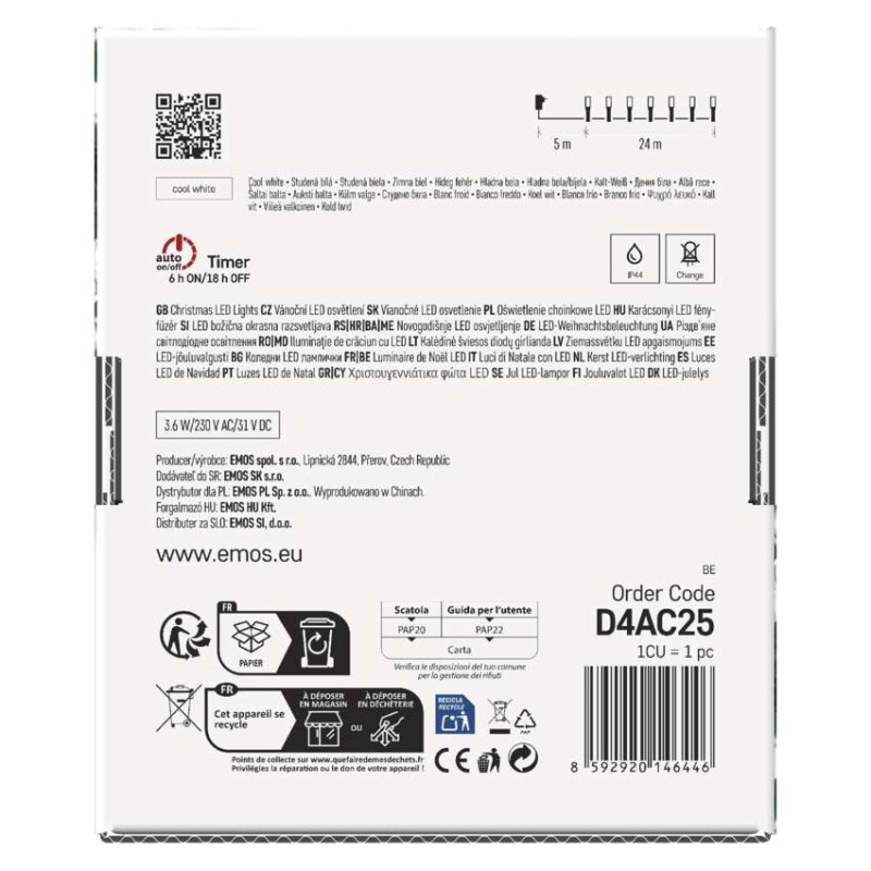 EMOS LED vánoční řetěz, 24 m, venkovní i vnitřní, studená bílá, programy, časovač
