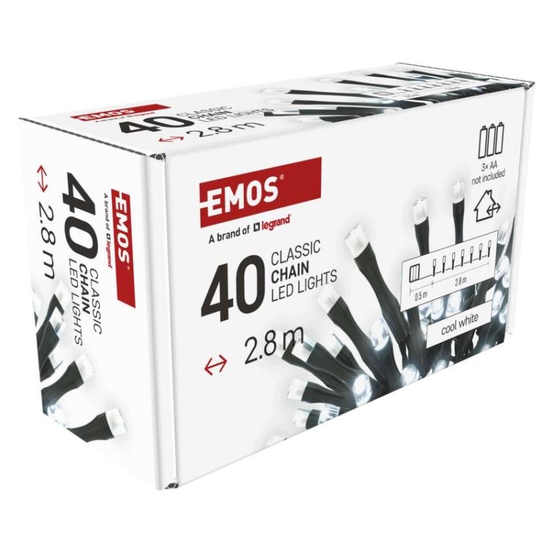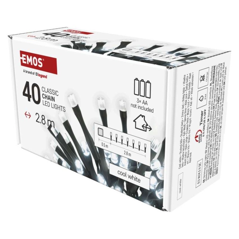 EMOS LED vánoční řetěz, 2,8 m, 3x AA, venkovní i vnitřní, studená bílá, časovač