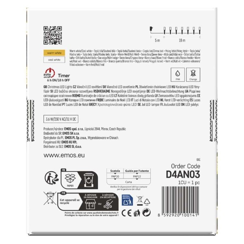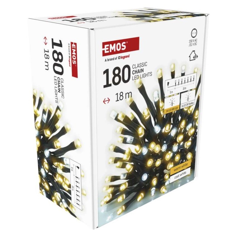 EMOS LED vánoční řetěz blikající, 18 m, venkovní i vnitřní, teplá/studená bílá, časovač