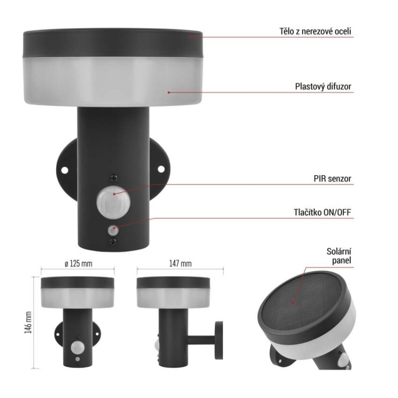 Díky solárnímu napájení je instalace extrémně jednoduchá – bez nutnosti zásahu do elektroinstalace. Stačí umístit na vhodné slunné místo a svítidlo je připraveno k provozu.