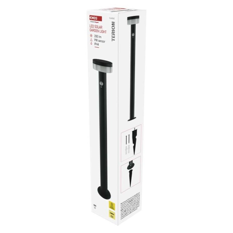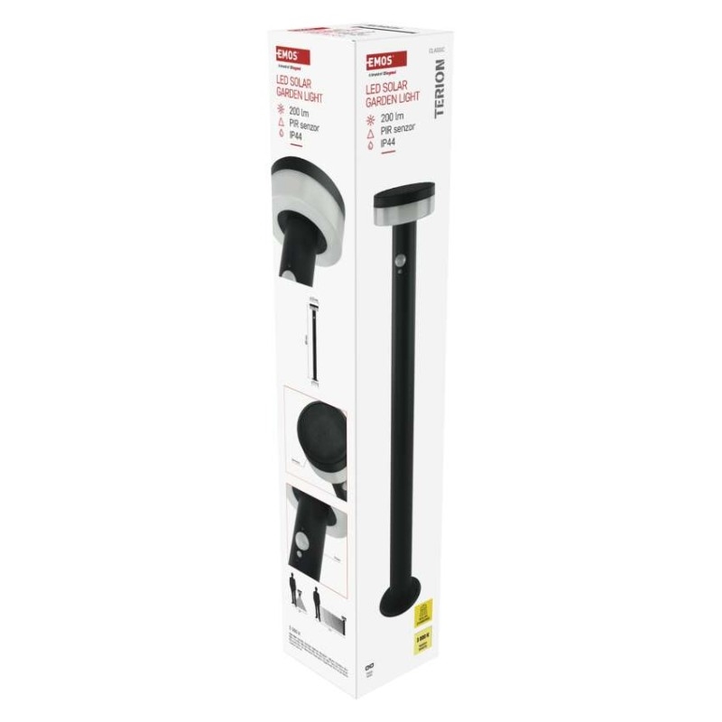 barva: antracit|barva světla: teplá bílá|dosah PIR senzoru: 10 m|energetická třída použitého světelného zdroje: –|fotovoltaický článek: 0,88 W|frekvence: –|index podání barev (CRI): > 80|kategorie: CLASSIC|krytí: IP44|materiál: nerezová ocel|materiál difuzoru: plast|napájení: Li-Ion akumulátor 3,7 V/1 200 mAh|napětí: –|patice (uchycení žárovky): –|PIR senzor: ano|příkon: 2 W|prodejní obal: 1 ks, krabička|řada: TERION|rozměr: 125 × 125 × 805 mm|rozsah pracovní teploty: 0 ~ +40 °C|soumrakový spínač: ano|světelný tok: max. 200 lm|teplota chromatičnosti: 3000 K|vestavěný vypínač: ano|žárovka součástí balení: –|zdroj světla: LED|životnost: 25 000 h