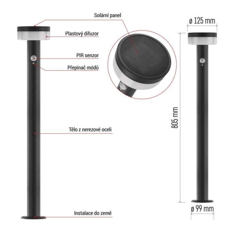 Díky solárnímu napájení je instalace extrémně jednoduchá – bez nutnosti zásahu do elektroinstalace. Stačí umístit na vhodné slunné místo a svítidlo je připraveno k provozu.