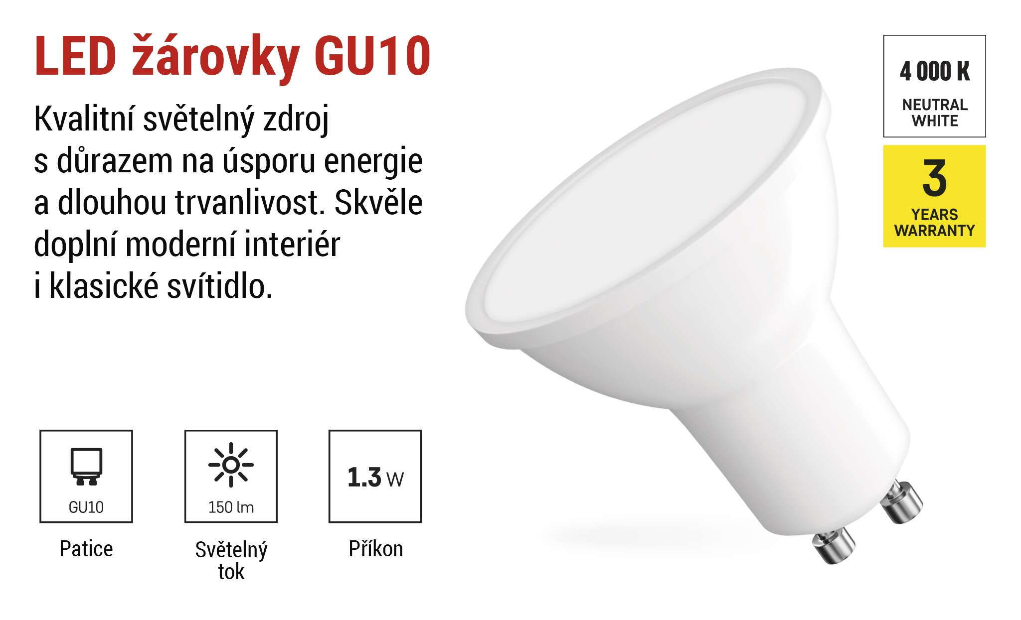 barva světla: neutrální bílá|energetická třída: E|frekvence: 50/60 Hz|index podání barev (CRI): 80|kompatibilita: –|náhrada za žárovku: 16 W|napětí: 220-240 V~|notifikace do mobilní aplikace: –|ovládání hlasovými asistenty: –|patice (uchycení žárovky): GU10|počet čipů: –|počet spínacích cyklů: 30 000|podporované OS: –|přenosová frekvence: –|příkon: 1,3 W|prodejní obal: 1 ks, krabička|protokol: –|řada: CLASSIC|rozměr: 50 × 50 × 58 mm|stmívatelná: ne|světelná účinnost: 115 lm/W|světelný tok: 150 lm|technologie: LED|teplota chromatičnosti: 4 000 K|tvar: MR16|typ čipů: SMD|účiník: 0,40|úhel vyzařování: 100°|záruční doba: 3 roky|životnost: 30 000 hodin