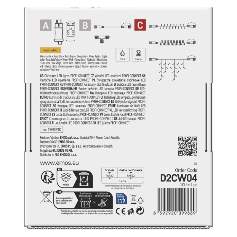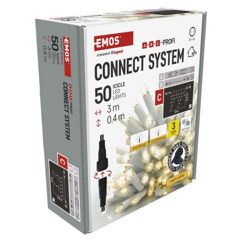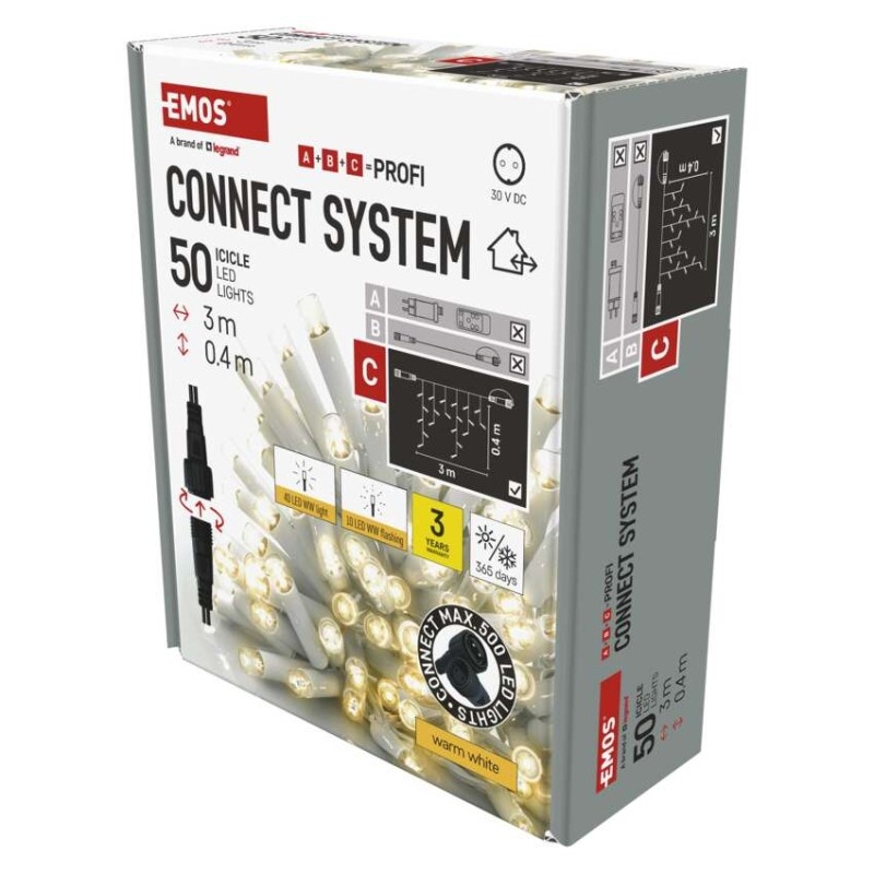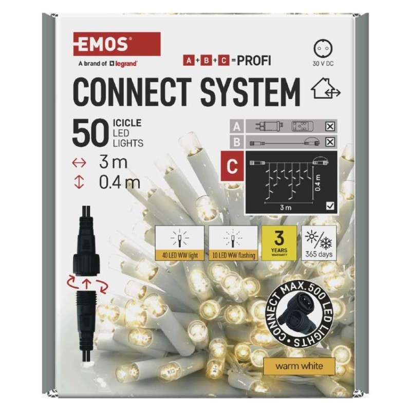 Světelné LED krápníky (rampouchy) CONNECT SYSTEM PROFI jsou dispozici v délce 3 m a výšce 0,4 m. Hledáte-li barvu, která bude nejlépe ladit s exteriérem či interiérem vašeho domu, můžete vybírat z teplé bílé, studené bílé nebo barevných kombinací s více barvami LED světýlek na jednom řetězu.