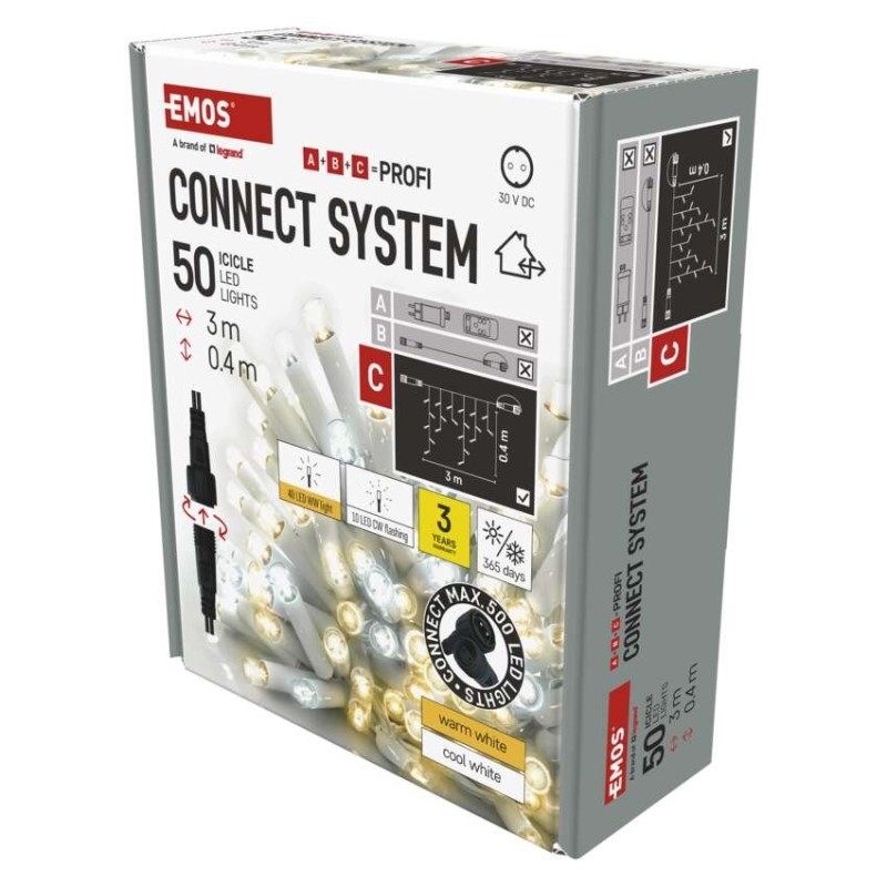 Světelné LED krápníky (rampouchy) CONNECT SYSTEM PROFI jsou dispozici v délce 3 m a výšce 0,4 m. Hledáte-li barvu, která bude nejlépe ladit s exteriérem či interiérem vašeho domu, můžete vybírat z teplé bílé, studené bílé nebo barevných kombinací s více barvami LED světýlek na jednom řetězu.