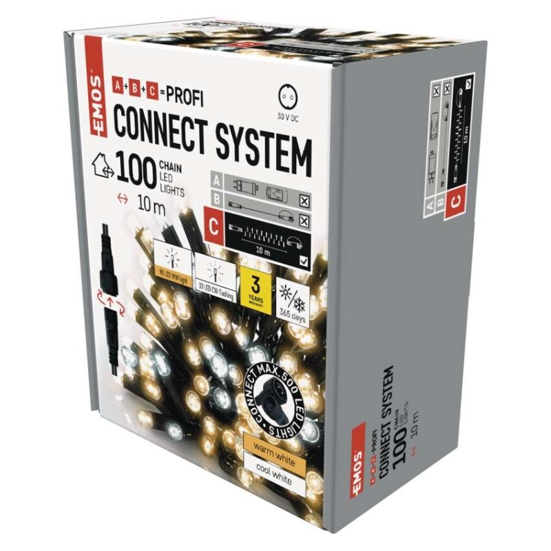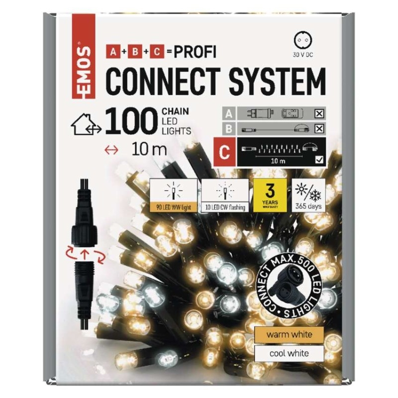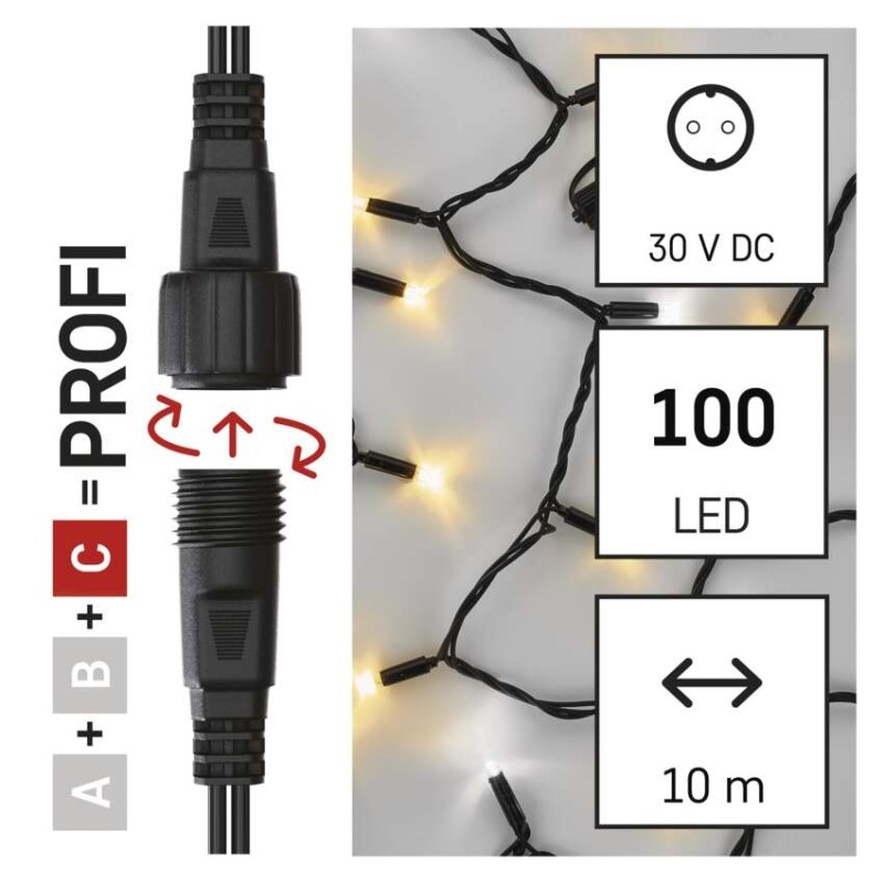 Propojovací systém CONNECT SYSTEM PROFI je díky stupni krytí IP44 vhodný k vnitřnímu i venkovnímu použití. Vyznačuje se zvýšenou odolností materiálu a prodlouženou zárukou 3 let. Vysoce kvalitní gumové kabely umožňují celoroční instalaci bez nutnosti demontáže za jakýchkoliv teplotních podmínek. Vybírat můžete ze standardních řetězů, krápníků a clusterů. Z jediného napájecího zdroje (A) připojeného k prodlužovacím kabelům, rozbočovačům (B) a světelným LED prvkům (C) je možné napájet až 500 LED světýlek.