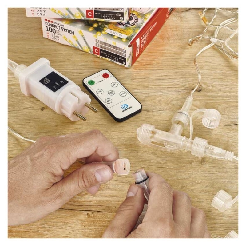 Ať už jde o vánoční výzdobu domova nebo vytvoření magické atmosféry na svatbách a oslavách. Spojovací osvětlení CONNECT SYSTEM ve verzích STANDARD a PROFI nabízí nekonečné možnosti dekorování. Základními prvky jsou napájecí zdroje (A), prodlužovací kabely a rozbočovače (B) a světelné prvky (C), které lze mezi sebou vzájemně propojovat a kombinovat. Tento typ osvětlení je ideální volbou pro velkolepou venkovní výzdobu, kde běžné délky řetězů nejsou dostačující.