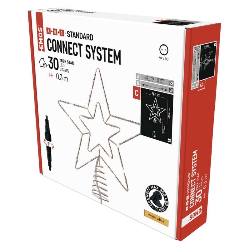 Propojovací systém CONNECT SYSTEM STANDARD je díky stupni krytí IP44 vhodný k vnitřnímu i venkovnímu použití, avšak pouze v sezónu, nikoliv po celý rok. Výhodou tohoto spojovacího systému je široká nabídka LED světelných prvků (C) v několika různých barvách. Ačkoliv je nejpopulárnějším vánočním osvětlením řetěz, ve spojovacím systému můžete vybírat podle vlastních designových preferencí z krápníků, záclon, sítí nebo hvězd na špičku vánočního stromu. Z jediného napájecího zdroje (A) připojeného k prodlužovacím kabelům, rozbočovačům (B) a světelným LED prvkům (C) je možné napájet až 800 LED světýlek.