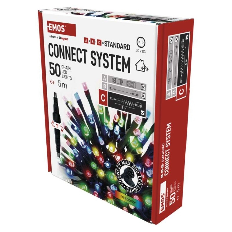 Propojovací systém CONNECT SYSTEM STANDARD je díky stupni krytí IP44 vhodný k vnitřnímu i venkovnímu použití, avšak pouze v sezónu, nikoliv po celý rok. Výhodou tohoto spojovacího systému je široká nabídka LED světelných prvků (C) v několika různých barvách. Ačkoliv je nejpopulárnějším vánočním osvětlením řetěz, ve spojovacím systému můžete vybírat podle vlastních designových preferencí z krápníků, záclon, sítí nebo hvězd na špičku vánočního stromu. Z jediného napájecího zdroje (A) připojeného k prodlužovacím kabelům, rozbočovačům (B) a světelným LED prvkům (C) je možné napájet až 800 LED světýlek.