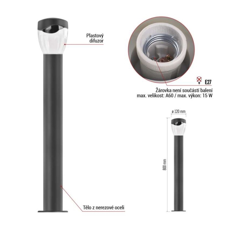 barva: antracit|barva světla: –|dosah PIR senzoru: –|energetická třída použitého světelného zdroje: –|fotovoltaický článek: ne|frekvence: 50/60 Hz|index podání barev (CRI): –|kategorie: CLASSIC|krytí: IP44|materiál: nerezová ocel|materiál difuzoru: plast|napájení: 230 V AC|napětí: 220-240 V~|patice (uchycení žárovky): E27|PIR senzor: ne|příkon: –|prodejní obal: 1 ks, krabička|řada: ARTEO|rozměr: 120 × 120 × 800 mm|rozsah pracovní teploty: -20 ~ +40 °C|soumrakový spínač: ne|světelný tok: –|teplota chromatičnosti: –|vestavěný vypínač: ne|žárovka součástí balení: ne|zdroj světla: –|životnost: –
