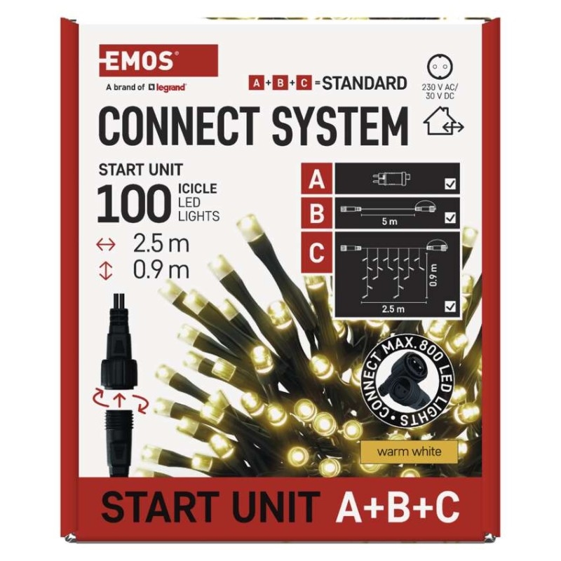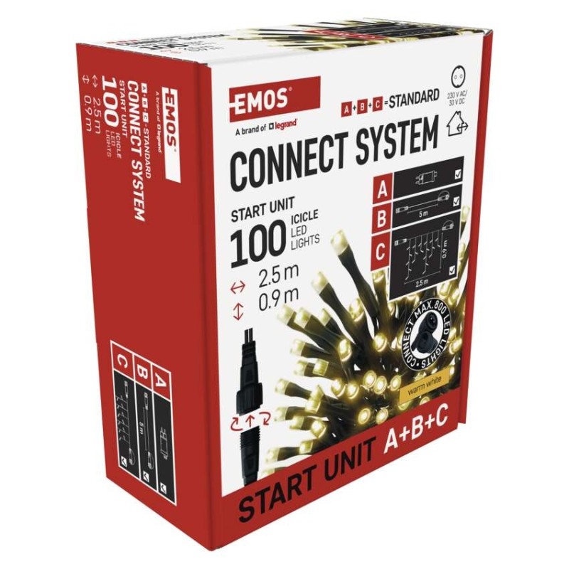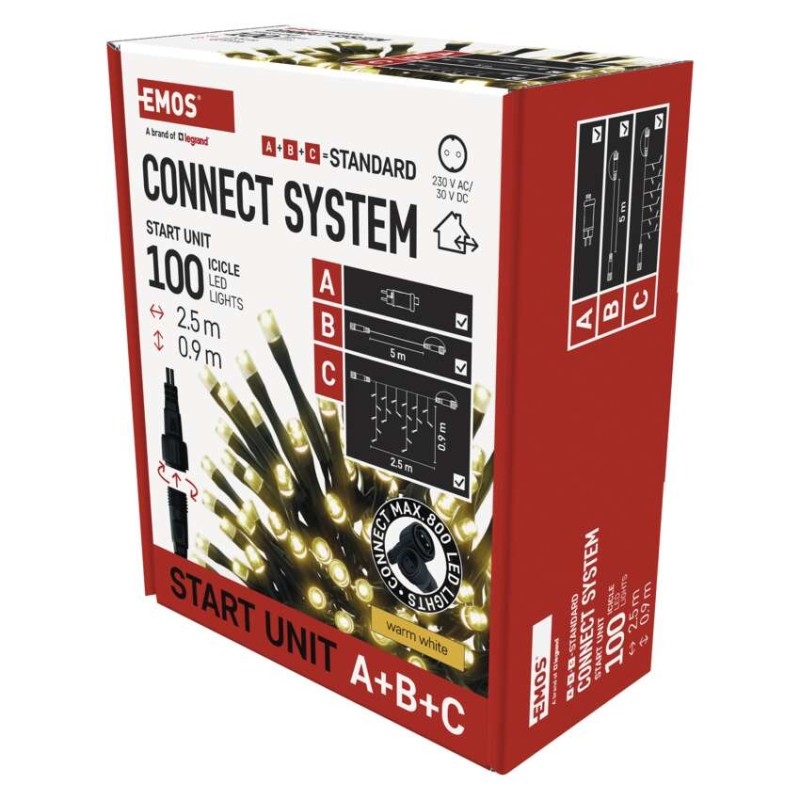 Základní sada systému CONNECT STANDARD obsahuje vše potřebné k tomu, abyste mohli ihned začít s výzdobou vašeho domu, zahrady nebo interiéru. V jednom balení naleznete tři základní komponenty systému nutné pro jeho provoz – napájecí zdroj s časovačem (A), prodlužovací kabel o délce 5 m (B) a vánoční krápníky (rampouchy) o délce 2,5 m se 100 LED diodami (C).