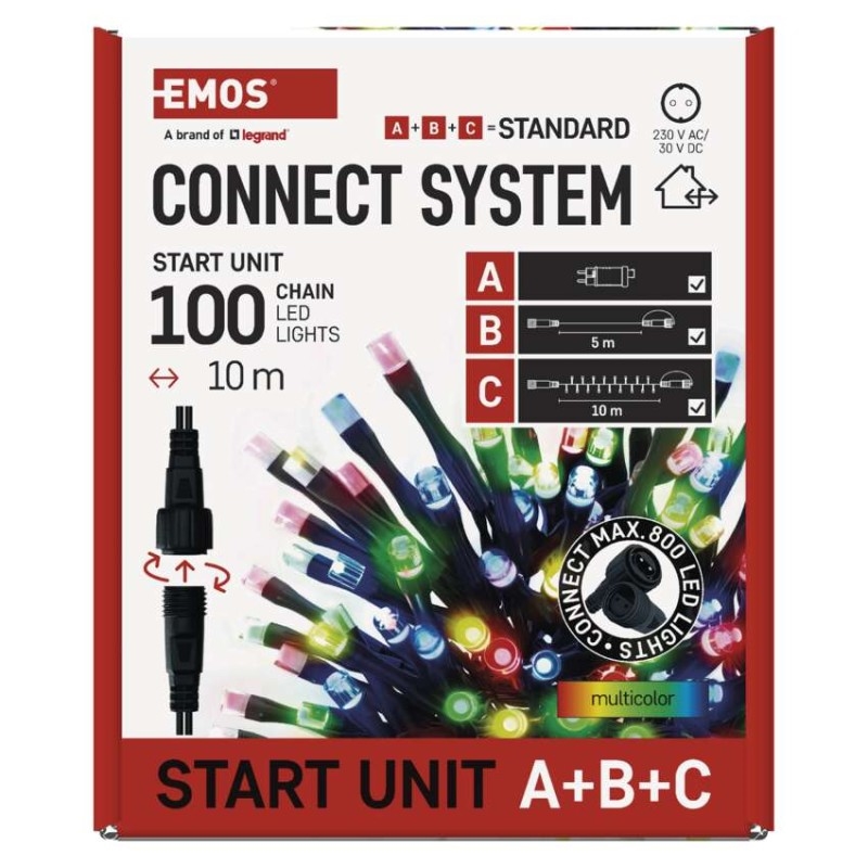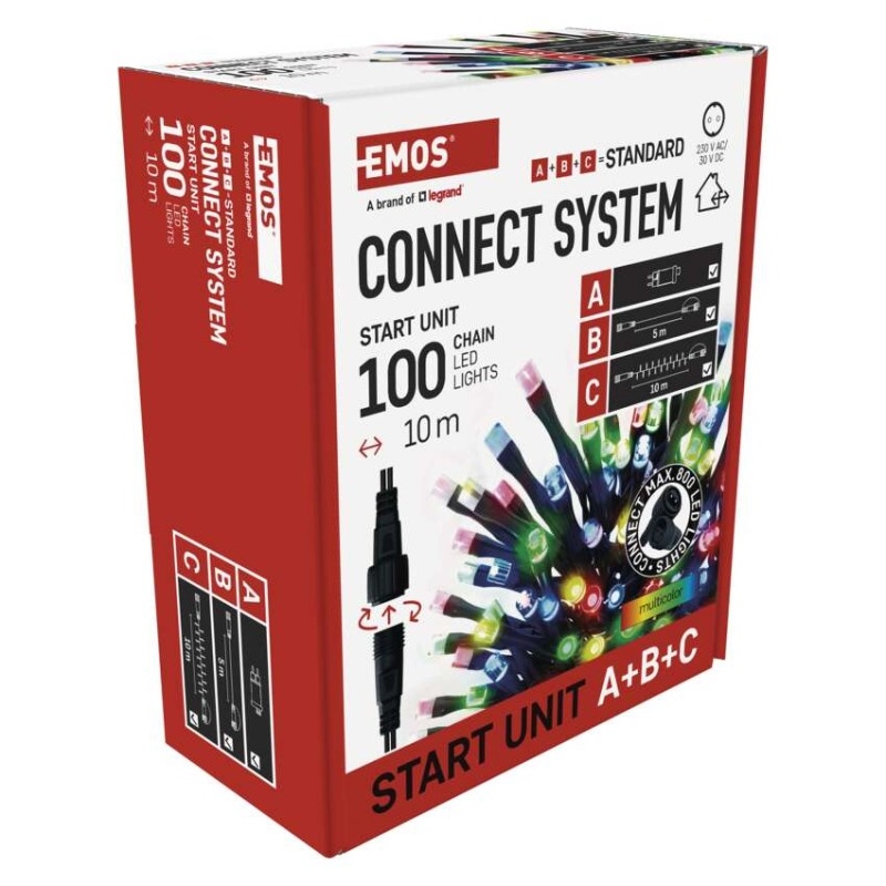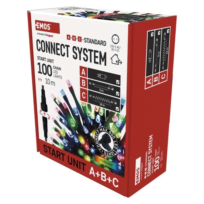 Propojovací systém CONNECT SYSTEM STANDARD je díky stupni krytí IP44 vhodný k vnitřnímu i venkovnímu použití, avšak pouze v sezónu, nikoliv po celý rok. Výhodou tohoto spojovacího systému je široká nabídka LED světelných prvků (C) v několika různých barvách. Ačkoliv je nejpopulárnějším vánočním osvětlením řetěz, ve spojovacím systému můžete vybírat podle vlastních designových preferencí z krápníků, záclon, sítí nebo hvězd na špičku vánočního stromu. Z jediného napájecího zdroje (A) připojeného k prodlužovacím kabelům, rozbočovačům (B) a světelným LED prvkům (C) je možné napájet až 800 LED světýlek.