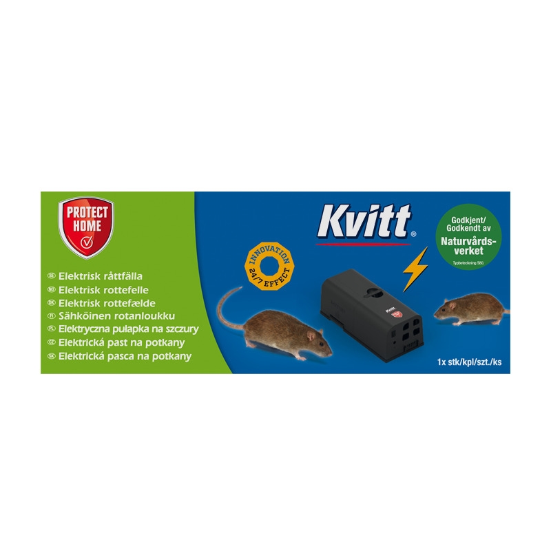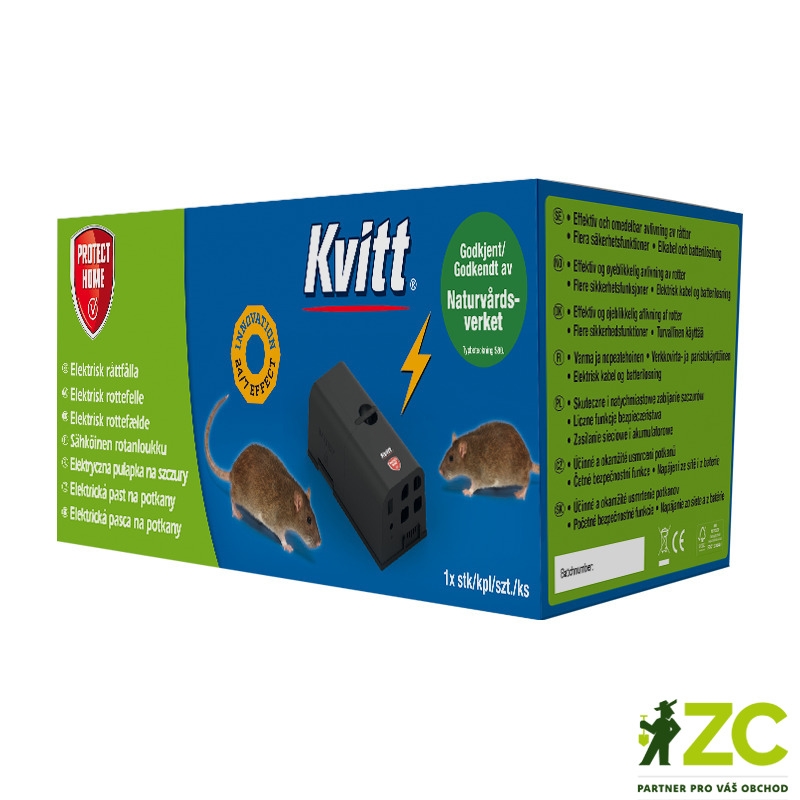 Elektrická past na krysy Kvitt je velmi účinný a rychlý způsob kontroly potkanů. Krysy jsou do pasti přilákány pomocí vložené návnady. Když se krysa dotkne kovové desky uvnitř, je usmrcena elektrickým proudem. Potkani rychle a bezbolestně uhynou. Mrtvé hlodavce lze snadno odstranit, aniž byste se jich dotkli. Elektrická past má řadu bezpečnostních prvků pro uživatele. Past funguje jak na napájecí kabel, který je součástí balení, tak na baterie (baterie nejsou součástí balení).