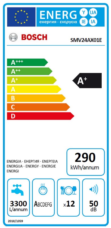 spotřeba energie v programu Eco 50: 290 kWh/rok na základě 280 standardních mycích cyklů (napojení na studenou vodu) a spotřebě v režimech s nízkou spotřebou energie. Skutečná spotřeba energie závisí na způsobu používání spotřebiče.