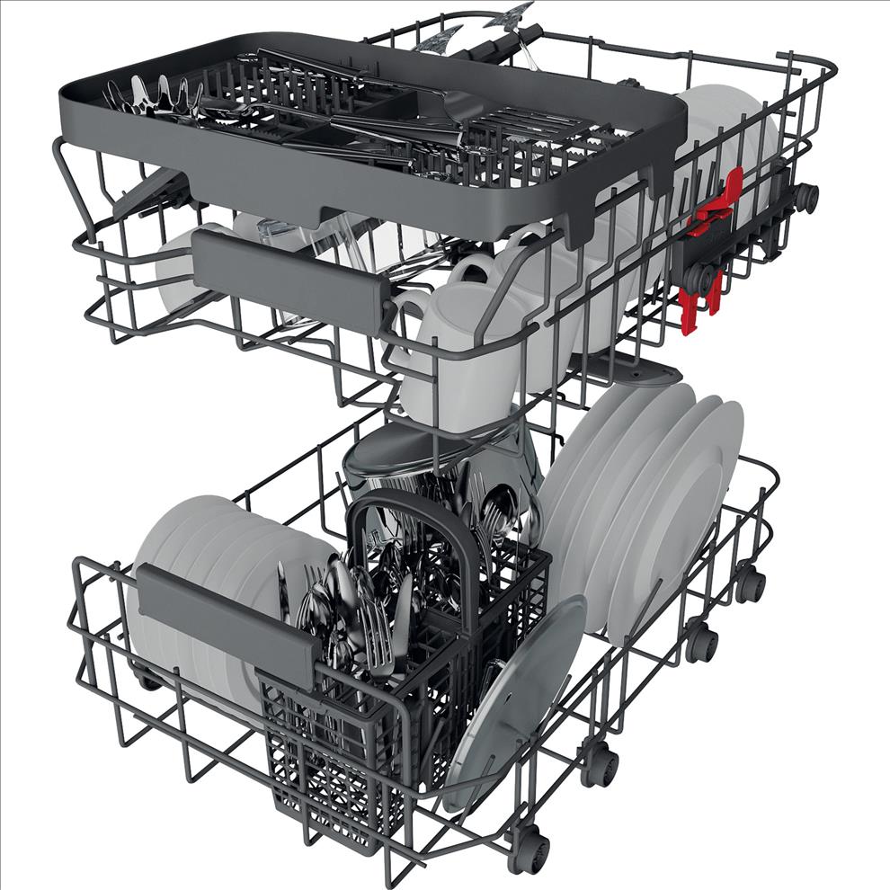 Praktická výbava – nerezový filtr, nastavitelné nožičky, vyjímatelný a výškově nastavitelný horní koš nebo košík na příbory v dolní části.