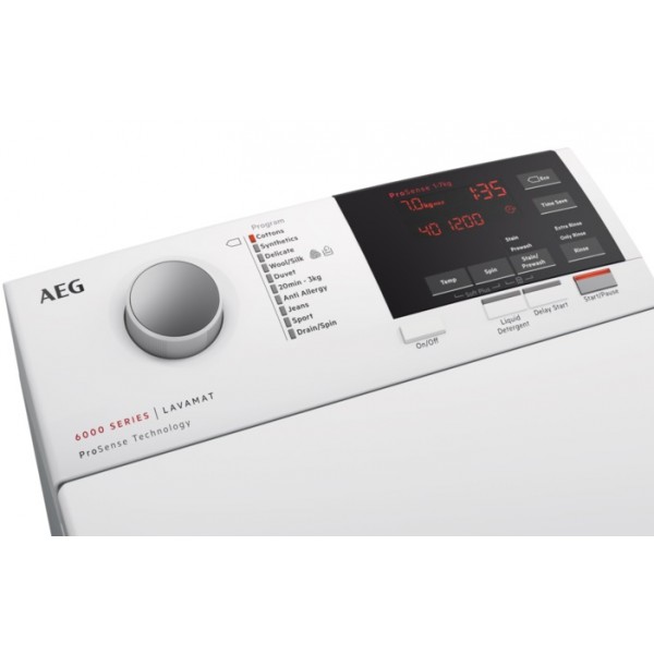 Vrchem plněná pračka AEG ProSense™ LTX6G371C v energetické třídě A+++, která má kapacitu na 7kg prádla, Zabraňuje opotřebení tkaniny a chrání barvy. 1300 otáček, certifikát Woolmark Blue.
