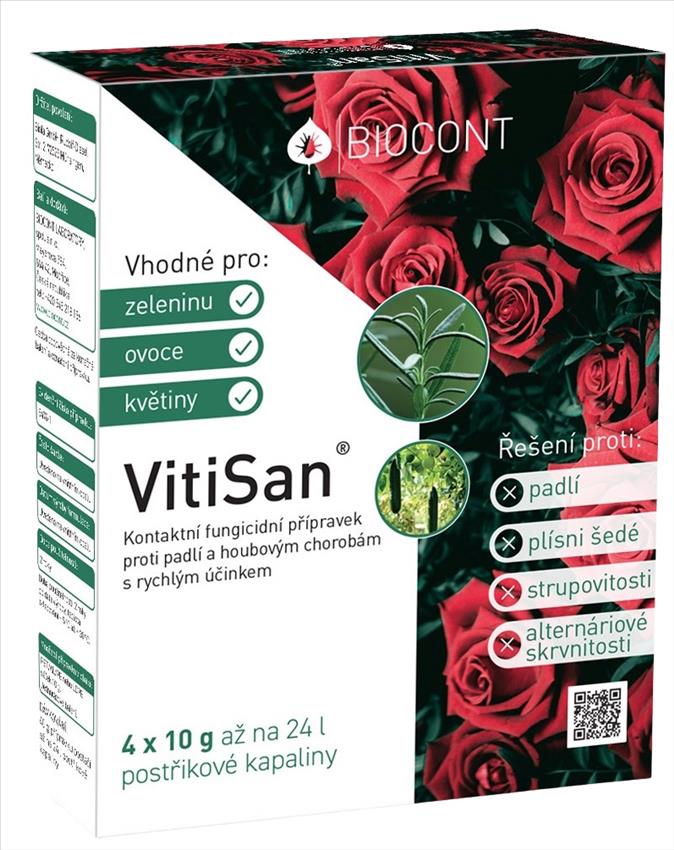 VitiSan je kontaktní biologický fungicidní přípravek zvyšující odolnost rostlin proti padlí a plísni šedé u révy vinné, padlí a strupovitosti u jádrového ovoce a padlí na zelenině. Po aplikaci dochází k narušení a následnému vysušení původců choroby (mycelia) a zamezení klíčení spor. Tak je zabráněno další infekci. Pro dobrou účinnost je důležité dosáhnout souvislého pokrytí porostu.