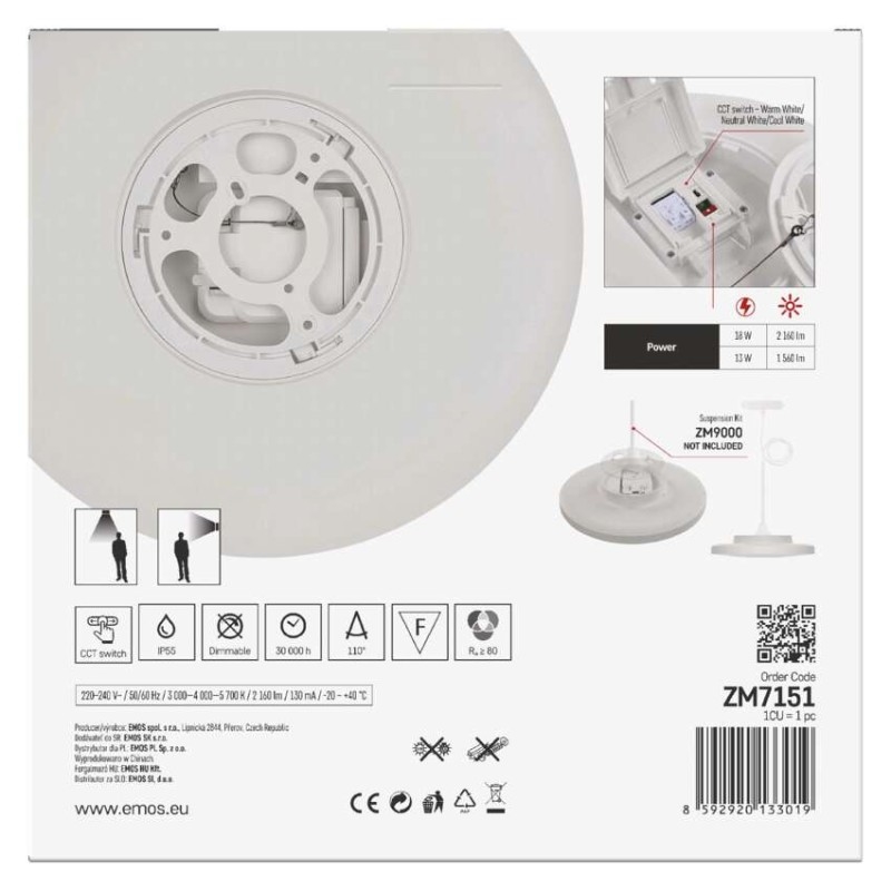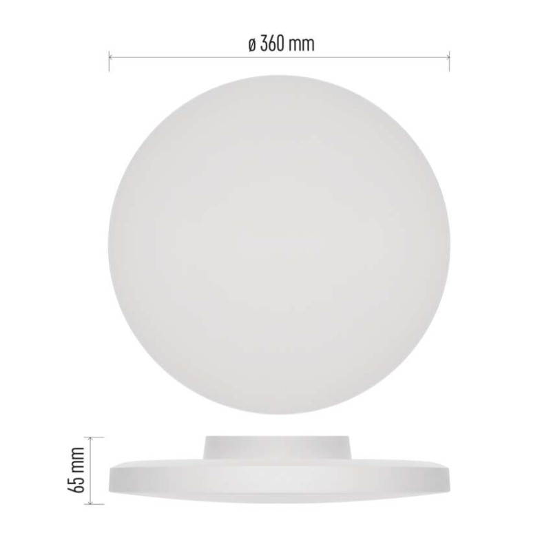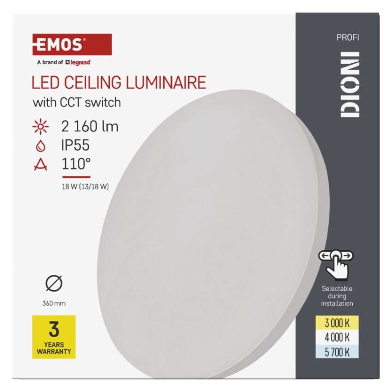 barva světla: teplá/neutrální/studená bílá|barva těla: bílá|dálkový ovladač: ne|další funkce: –|do chodby a na schodiště: ano|do dílny a garáže: ne|do kanceláře: ano|do koupelny: ano|do kuchyně: ano|do obýváku, ložnice a dětského pokoje: ano|dosah senzoru: neuvádí se|flicker-free: nebliká|frekvence: 50/60 Hz|index podání barev (CRI): Ra > 80|jazyky aplikace: –|kategorie: PROFI|kompatibilita: –|krytí: IP55|materiál difuzoru: plast|materiál LGP: neuvádí se|materiál těla: plast|montážní otvor: ne|možnost stmívání: ne|náhrada za žárovku: 130 W|napětí: 220–240 V~|na zahradu a balkon: ano|notifikace do mobilní aplikace: ne|obsah balení: –|ovládání hlasovými asistenty: ne|podporované OS: –|pohybový senzor: ne|přenosová frekvence: –|příkon: 18 W|prodejní obal: 1 ks, krabice|protokol: –|proud: 70 mA|řada: DIONI|rozměr: průměr 360 × 65 mm|světelná účinnost: 120 lm/W|světelný tok: 2 160 lm|teplota chromatičnosti: 3 000/4 000/5 700 K|tvar: kruh|typ difuzoru: mléčný|typ svítidla: klasické svítidl