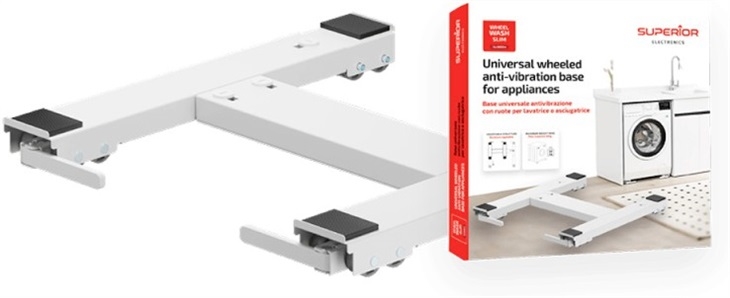 Antivibrační podložka na kolečkách pro pračky, sušičky, sporáky, myčky nebo chladničky. Nastavitelná v rozsahu 37 x 37 až 62 x 62 cm, Nosnost 90 kg, Výška podstavce včetně koleček a gumových nožiček 40 mm, Ergonomický brzdový systém, kovová konstrukce bílé provedení