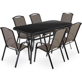 Sestava kovového nábytku složená ze 6 křesel a stolu. Stůl o rozměru 150 x 96 x 71 cm s deskou z černého tvrzeného skla. Rozměr křesel 55 x 73 x 94 cm, výplň z umělé textílie. Možnost umístění slunečníku. Zcela bezúdržbový. Vhodné pro venkovní i vnitřní použití