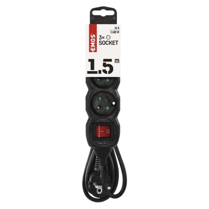 Černý prodlužovací přívod, 3 zásuvka s vypínačem, délkou 1,5 m a průřezem vodiče 1 mm2. Vhodný pro maximální zátěž 16 A max.