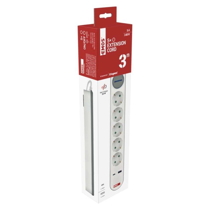 Prodlužovací přívod s vypínačem. 250V~/16A max. 5 zásuvek s dětskými clonkami. USB A+C 3,1 A, 15,5 W max. Délka přívodního kabelu 3 m. Vodič H05VV-F3G 1,5mm2.