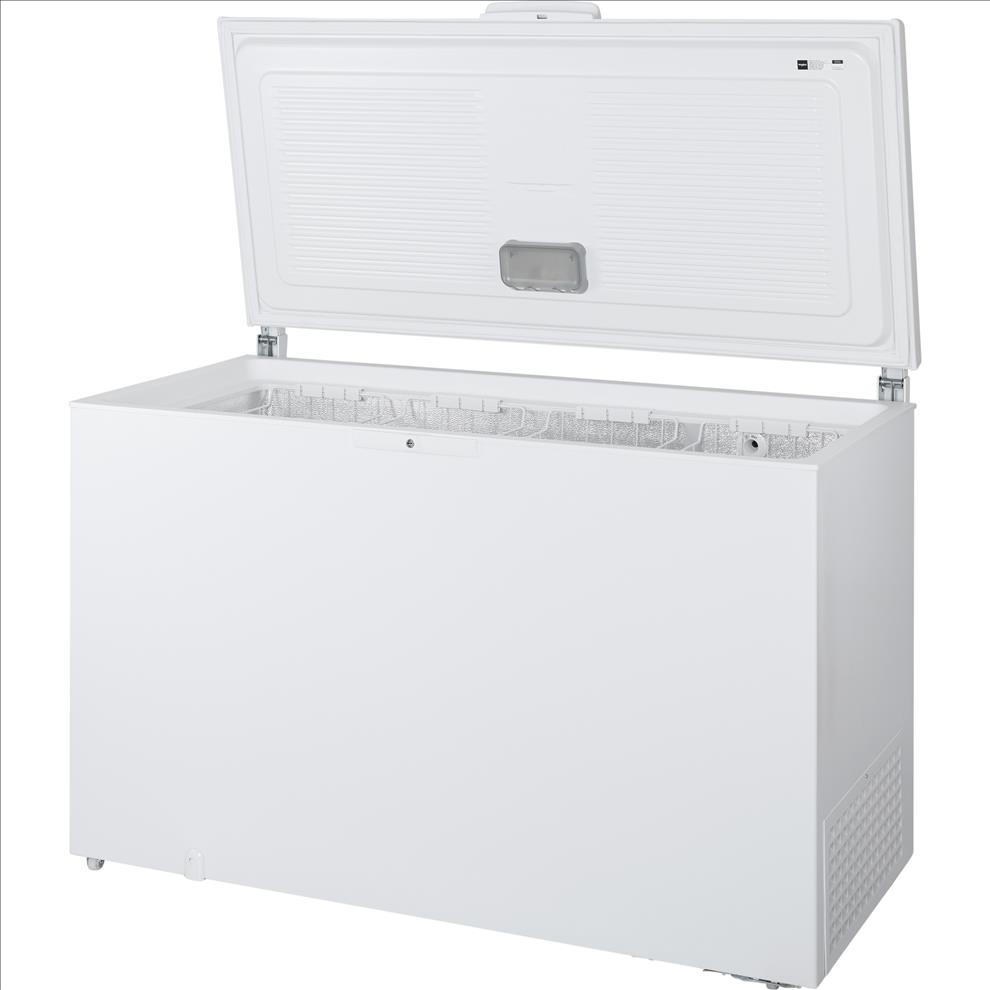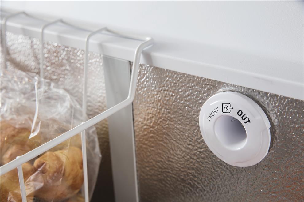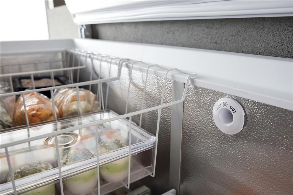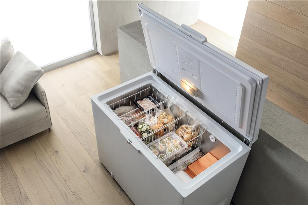 Truhlicová mraznička má systém vyvažování dveří, takže se snadno otevírá a zavírá a při otevření zůstávají dvířka ve stabilní poloze.