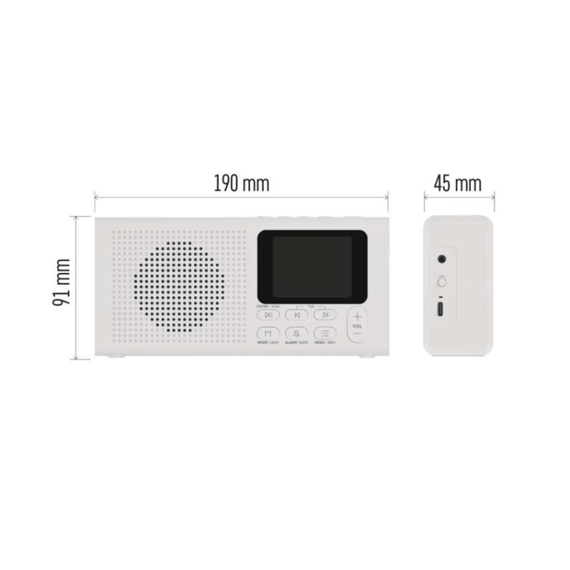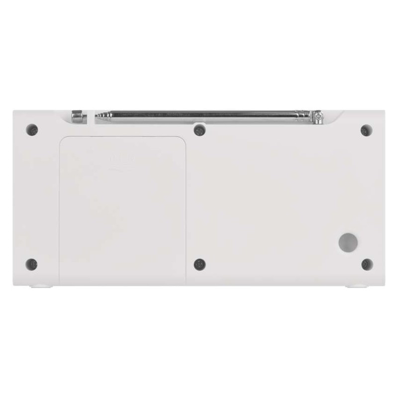 anténa: teleskopická s kloubem|barva: bílá|bluetooth pro připojení např. telefonu, tabletu: ano|displej: barevný displej 2,4" TFT|doba provozu na baterii: dle použitých baterií|dosah bluetooth: 10 m|frekvence tuneru: 87,5–108 Mhz/174,9–239,2 Mhz|frekvenční rozsah reproduktoru: neuvádí se|funkce budíku: ano|funkce handsfree: ne|hmotnost: 337 g|integrovaný mikrofon: ne|napájecí zdroj součástí dodávky: ano|napájení: 4× AA 1,5 V (tužka)|odstup signálu/šum: neuvádí se|podpora MP3: ne|potlačení signálu: neuvádí se|prodejní obal: 1 ks, krabice|rádio: DAB/DAB+/FM|reproduktor: 50 mm/4 Ohm/3 W|rozměr: 190 × 91 × 45 mm|rozsah dekodéru MP3: neuvádí se|typ baterie: AA (tužka)|USB vstup: ne|verze bluetooth: 5.0|vstup AUX: ne|vstup pro microSD kartu: ne|výstup na sluchátka: ano