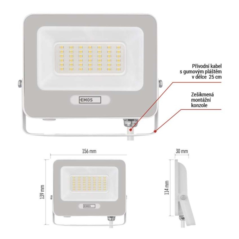 EMOS LED reflektor GLARO 30W, bílý, IP65, 3000 lm, neutrální bílá | DNO elektro