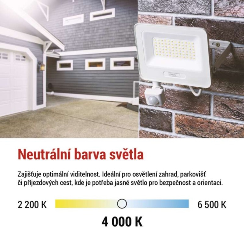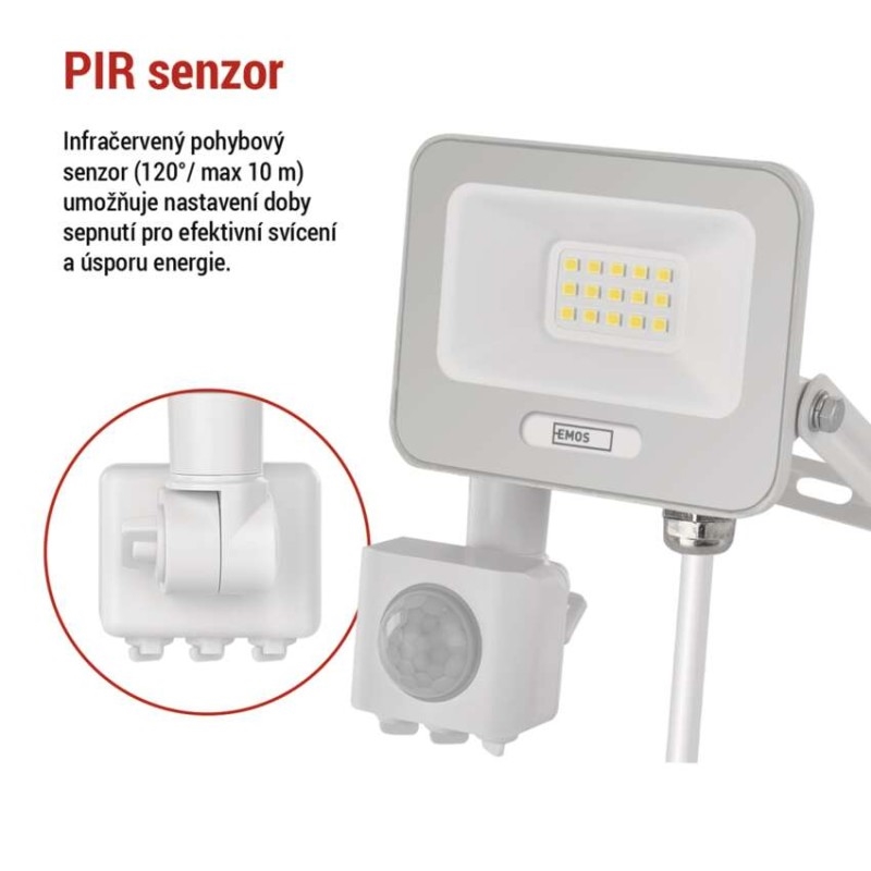 EMOS LED reflektor GLARO s pohybovým čidlem, 10 W, bílý, IP54, 1000 lm, neutrální bílá | DNO elektro