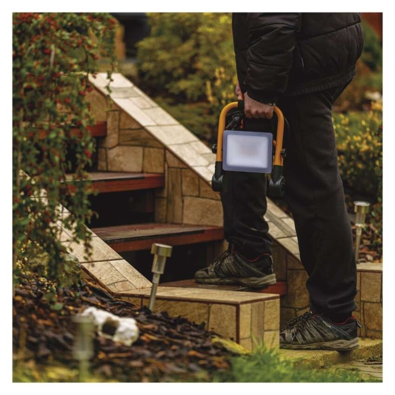 Právě se díváte na špičkový přenosný LED reflektor, který vyniká mimořádnou odolností. Předurčen je pro každodenní nasazení při osvětlování pracovních činností na stavbách, dílnách, v autoservisech, garážích apod. Skvěle poslouží i majitelům rodinných domů v okamžicích, kdy se jejich práce protáhne do pozdních nočních hodin. Ve srovnání s běžnými halogenovými reflektory s ním ušetříte až 75 % spotřeby elektrické energie.