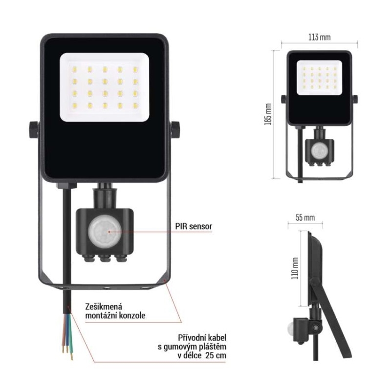 akumulátor: ne|barva: černá|barva světla: neutrální bílá|délka přívodního kabelu: 25 cm|doba svícení na AKU: –|dosah PIR senzoru: 10 m|energetická třída použitého světelného zdroje: D|flicker-free: ano|frekvence: 50/60 Hz|index podání barev (CRI): Ra > 80|kategorie: CLASSIC|krytí: IP54|materiál difuzoru: sklo|materiál přívodního kabelu: guma|materiál těla: hliník|napájení: ze sítě|napětí: 220–240 V~|PIR senzor: ano|počet průchozích zásuvek: –|použití: povrchová montáž|příkon: 10 W|prodejní obal: 1 ks, krabice|proud: 45 mA|řada: –|rozměr: 113 × 185 × 55 mm|rozsah pracovní teploty: -20 °C až +40 °C|stmívání: ne|stupeň ochrany proti mechanickým nárazům: –|světelná účinnost: 150 lm/W|světelný tok: 1 500 lm|teplota chromatičnosti: 4 000 K|typ přívodního kabelu: H05RN-F|typ průchozích zásuvek: –|typ stmívání: –|účiník: > 0,9|úhel vyzařování: 110°|záruční doba: 3 roky|zdroj světla: LED|životnost: 36 000 hodin|zkušební žárovka součástí balení: ne