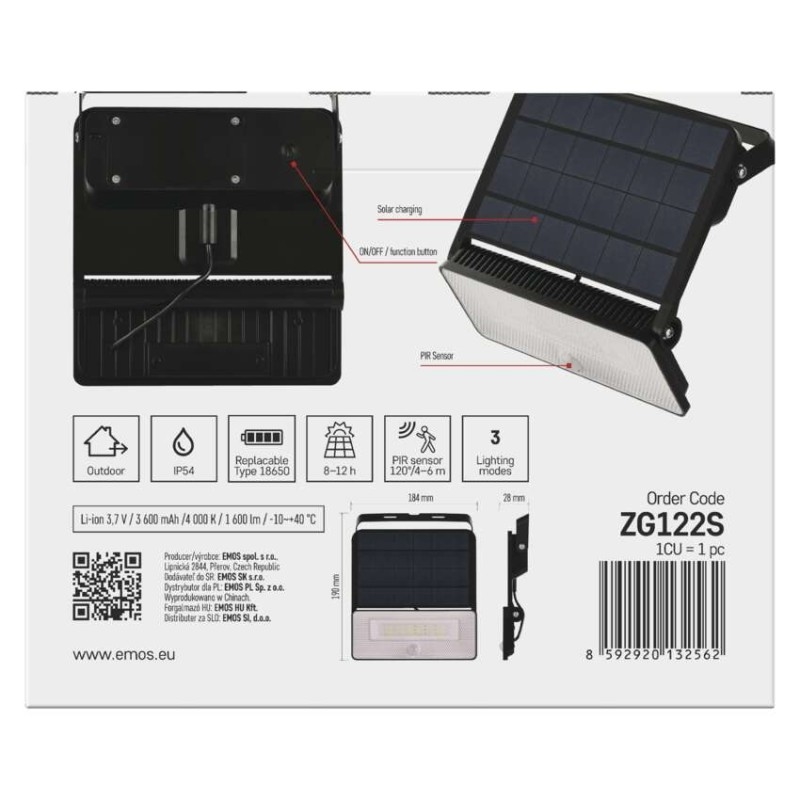 akumulátor: Li-Ion 3 600 mAh|barva: černá|barva světla: neutrální bílá|délka přívodního kabelu: neuvádí se|doba svícení na AKU: neuvádí se|dosah PIR senzoru: 6 m|energetická třída použitého světelného zdroje: neuvádí se|flicker-free: nebliká|frekvence: neuvádí se|index podání barev (CRI): Ra > 80|kategorie: CLASSIC|krytí: IP54|materiál difuzoru: plast (PC)|materiál přívodního kabelu: neuvádí se|materiál těla: plast (ABS+PC)|napájení: neuvádí se|napětí: 3,7 V|PIR senzor: ano|počet průchozích zásuvek: neuvádí se|použití: povrchová montáž|příkon: –|prodejní obal: 1 ks, krabice|proud: neuvádí se|řada: neuvádí se|rozměr: 196 × 130 × 37 mm|rozsah pracovní teploty: -10 °C až +40 °C|stmívání: neuvádí se|stupeň ochrany proti mechanickým nárazům: neuvádí se|světelná účinnost: neuvádí se|světelný tok: 1 600 lm|teplota chromatičnosti: 4 000 K|typ přívodního kabelu: neuvádí se|typ průchozích zásuvek: neuvádí se|typ stmívání: –|účiník: neuvádí se|úhel vyzařování: 100°|záruční doba: 3 roky|zdroj sv