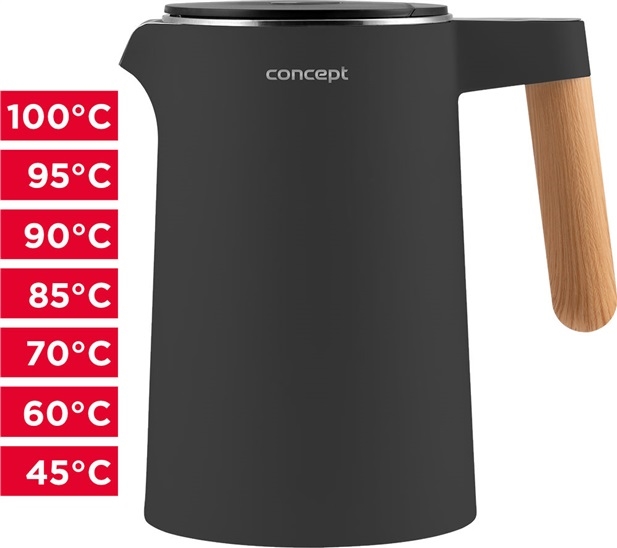 rychlovarná konvice; příkon 2200 W; objem 1,5 l; nerezový vnější plášť; funkce KEEP WARM pro udržení teploty; ochrana proti přehřátí