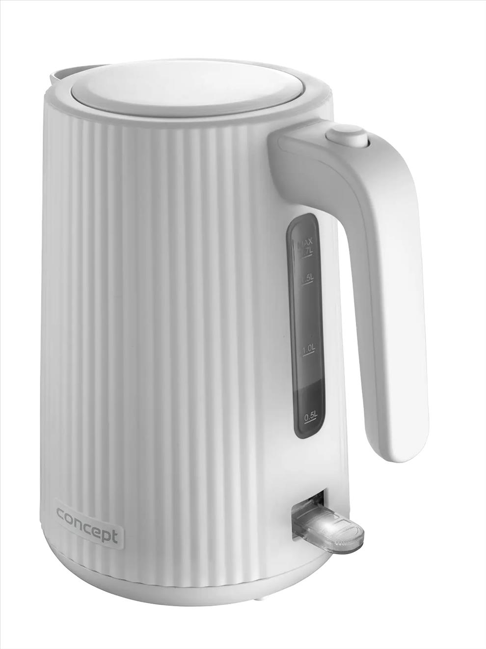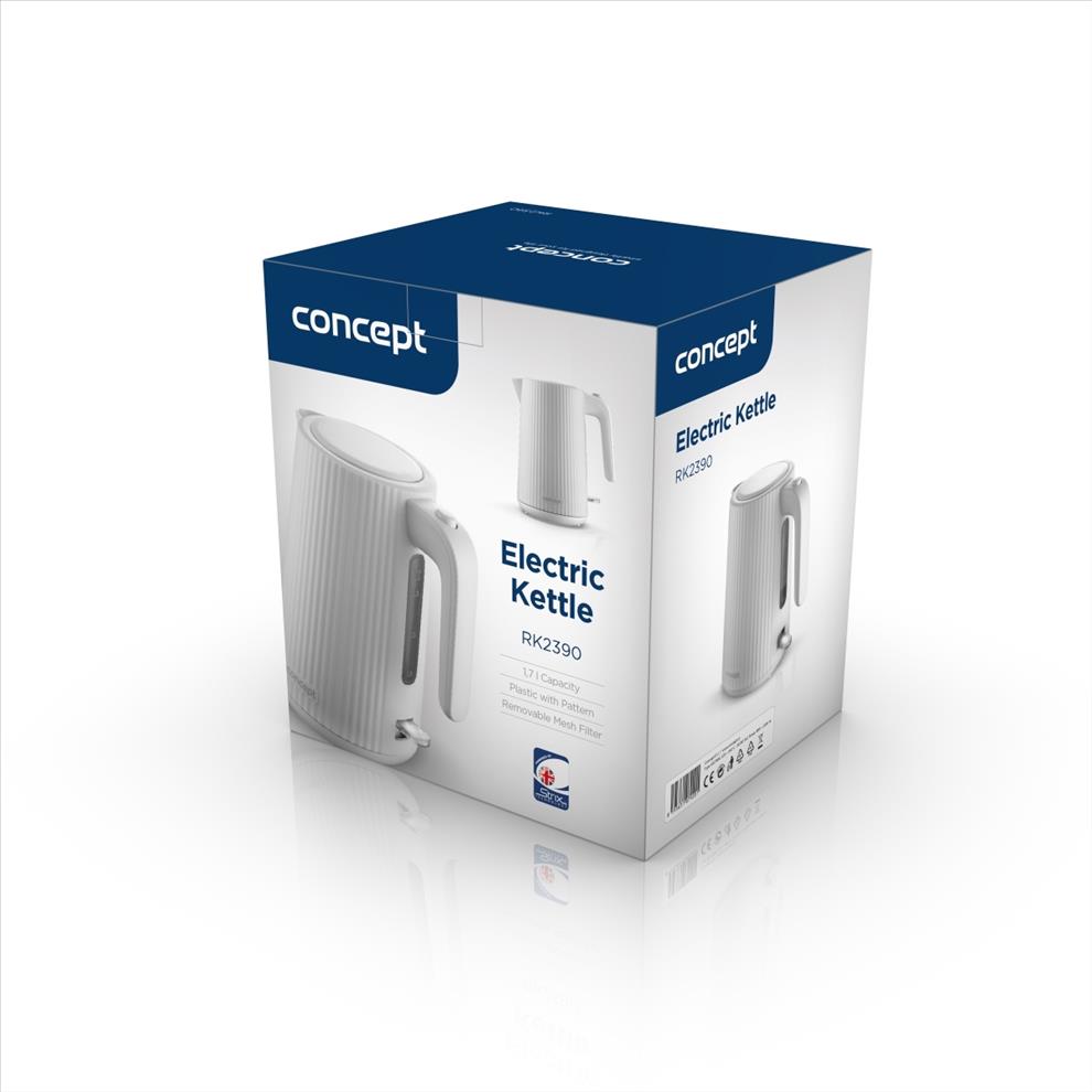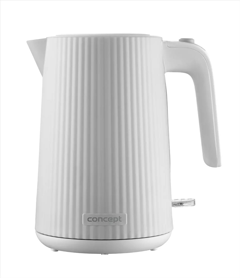 Rychlovarná konvice Concept RK2390 s objemem 1,7 l je vybavena trojnásobnou bezpečnostní pojistkou a značkovým konektorem Strix. Na první pohled zaujme atraktivním vroubkovaným designem v bílé barvě.