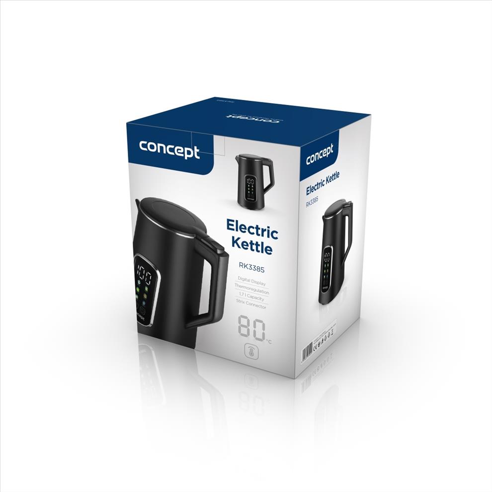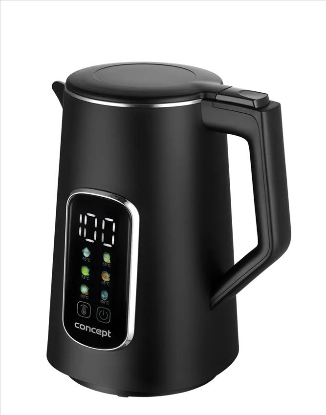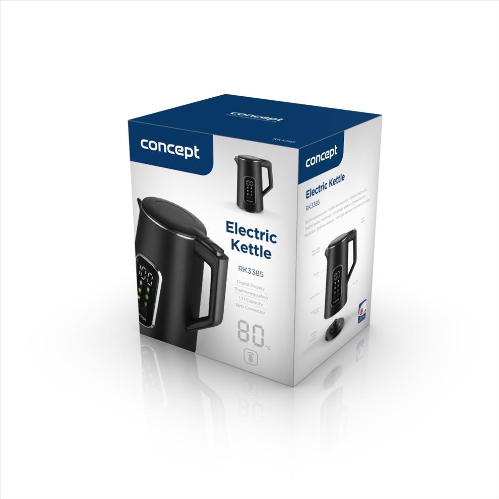 Rychlovarná konvice s objemem 1,7 l Concept RK3385 disponuje regulací teploty, barevným LED displejem, chladným povrchem cool touch, značkovým konektorem Strix a trojnásobnou bezpečnostní pojistkou.