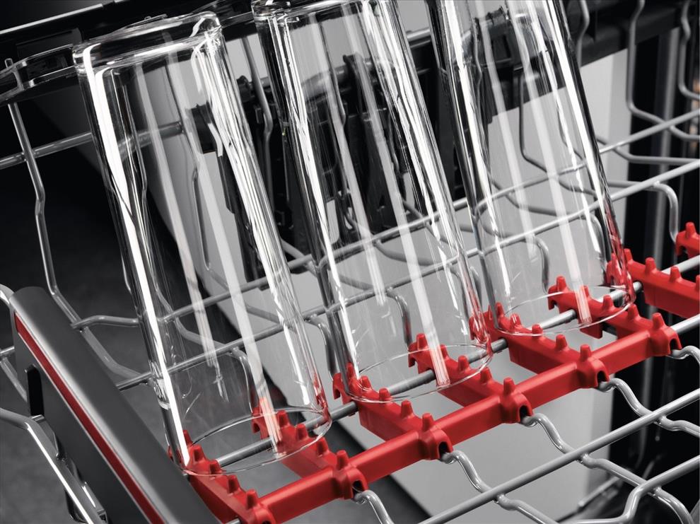 • Horní košík má 2 Red Soft Grips, 2 červené měkké špičky, skládací poličky na šálky, Plastové barevné držadlo