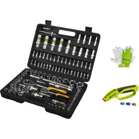 Gola sada 108 ks, 18x – 1/4" hlavice nástrčná s bity, 8x – 1/4" hlavice nástrčná prodloužená, 5x – 1/4" hlavice nástrčná, 2x – 1/4" prodloužení: 50mm a 75mm 1x – 1/4" kloub ráčnový, 1x – 1/4" trhák, 1x – 1/4" rukojeť šroubovací s vnitřním čtyřhranem, 1x –1/4" ráčna, 17x – 1/2" hlavice nástrčná, 5x – 1/2" hlavice nástrčná prodloužená, 8x – 1/2" hlavice nástrčná, 2x – 1/2" prodloužení: 125mm a 250mm, 1x – 1/2" kloub ráčnový, 1x – 1/2" ráčna, 2x – 1/2" hlavice na svíčky: 16 a 21mm, 3x – klíč imbus: 1.5,2,2.5mm, 1x – adaptér bity, 17x – bity, 1x – kufřík