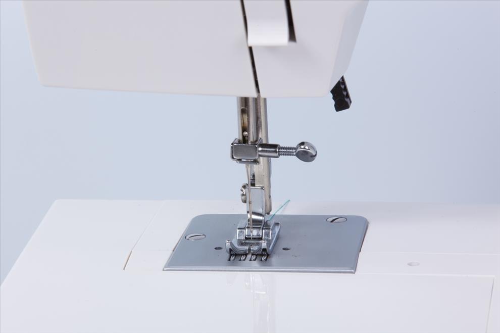 spolehlivé 4krokové šití knoflíkové dírky, plynulé nastavení délky stehu 0 - 4 mm, automatické nastavení tlaku přítlačné patky, nastavitelné napětí horní nitě, snadnou výměnu přítlačné patky pouhým zaklapnutím a automatické navíjení spodní cívky.