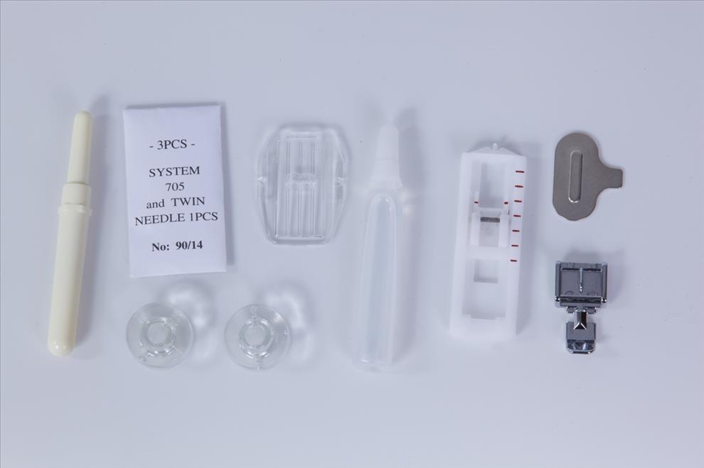 připravenost stroje pro šití dvojjehlou – již základní výbava zahrnuje jak kolík dvojjehly, tak i dvojjehlu. Stále oblíbenější šití dvojjehlou se používá na dekorativní šití a především půvabné vyšívání barevně zajímavých vzorů.