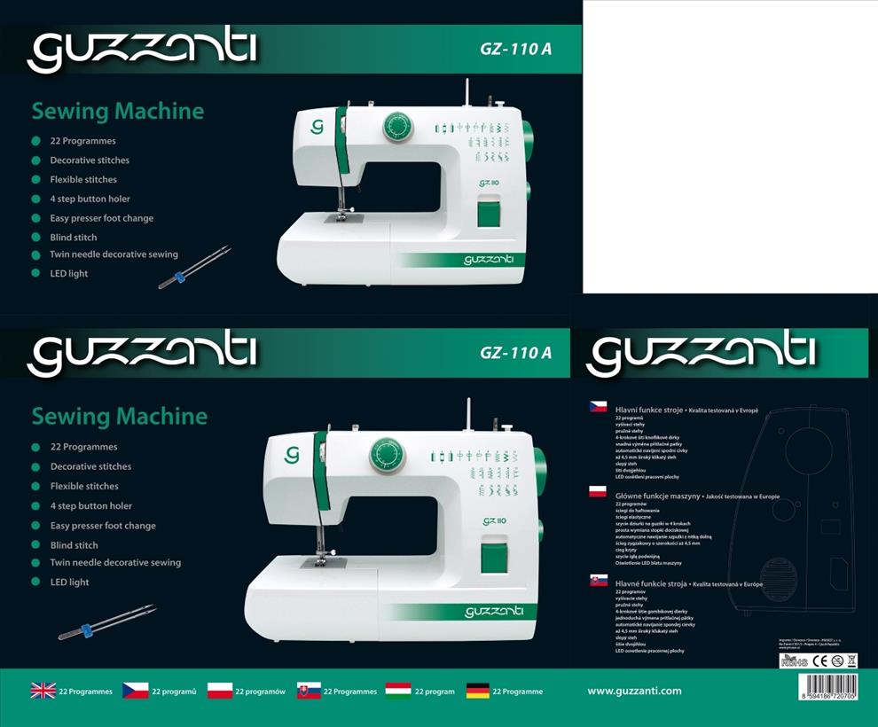 dokonalý výběr z 22 šicích programů a 19 stehů zahrnujících jak pružné, tak dekorativní stehy. Z pružných stehů jmenujme trojitý přímý, trojitý klikatý, jednostranně uzavřený overlockový pro moderní obrubování materiálů i jejich sešívání